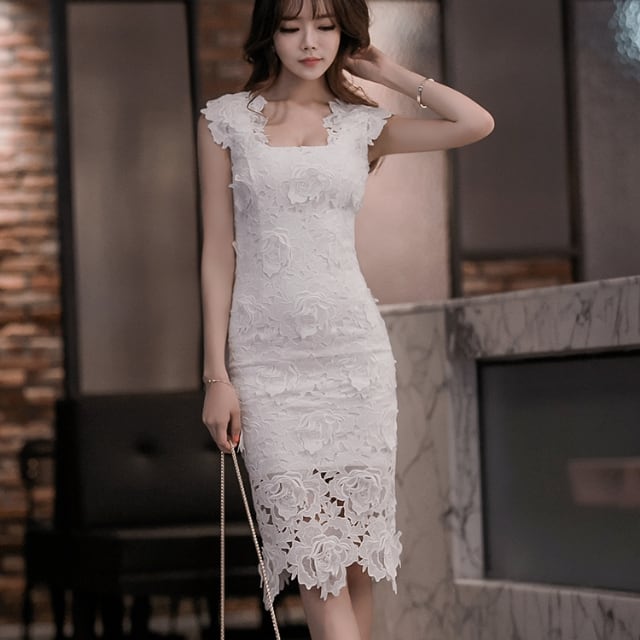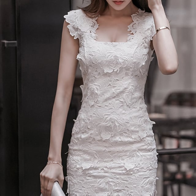 【予約販売】ワンピース レディース レース ひざ丈 マーメイド ミニワンピース ノースリーブ 細見え ホワイト お呼ばれ 結婚式 ドレス きれいめ ワンピ 大人可愛い エレガント おしゃれ こなれ感 韓国 S/M/L