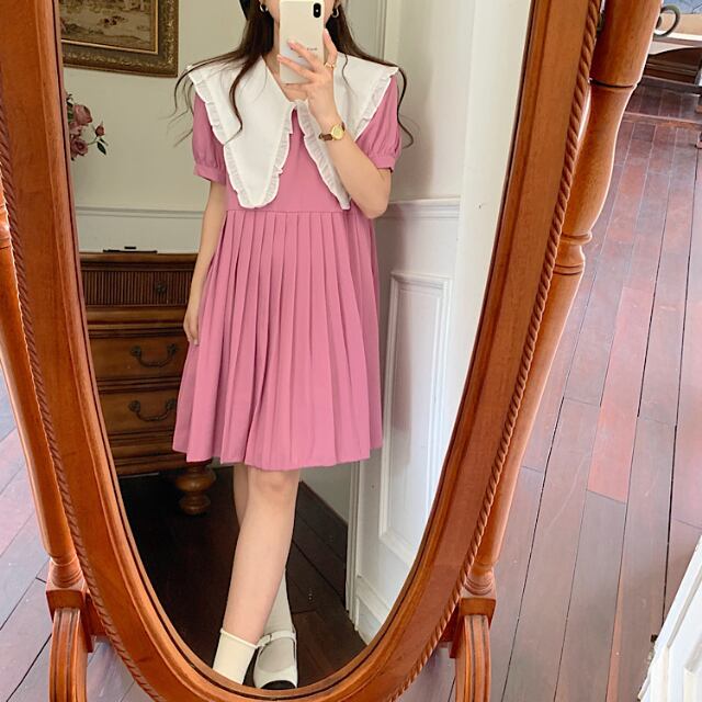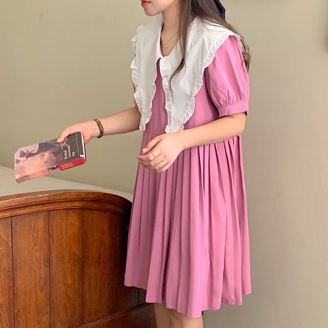 【予約販売】ワンピース レディース ピンク 襟 ビッグカラー プリーツ ミニワンピース Aライン ガーリー お呼ばれ 結婚式 ドレス きれいめ ワンピ 大人可愛い エレガント おしゃれ こなれ感 韓国 S/M/L/XL