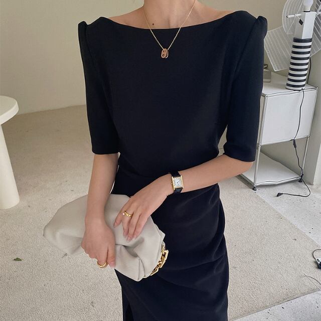 【予約販売】ワンピース レディース スリット タイト 5分袖 ブラック 黒 お呼ばれ 結婚式 ドレス きれいめ ワンピ 大人可愛い エレガント おしゃれ こなれ感 韓国 S/M/L