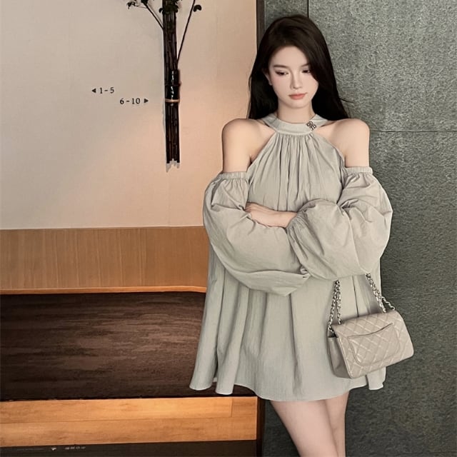 【予約販売】ワンピース レディース バルーン袖 ハイネック ホルターネック 肩だし ミニワンピース Aライン ブラック 黒 ホワイト お呼ばれ 結婚式 ドレス きれいめ ワンピ 大人可愛い エレガント おしゃれ こなれ感 韓国 フリー
