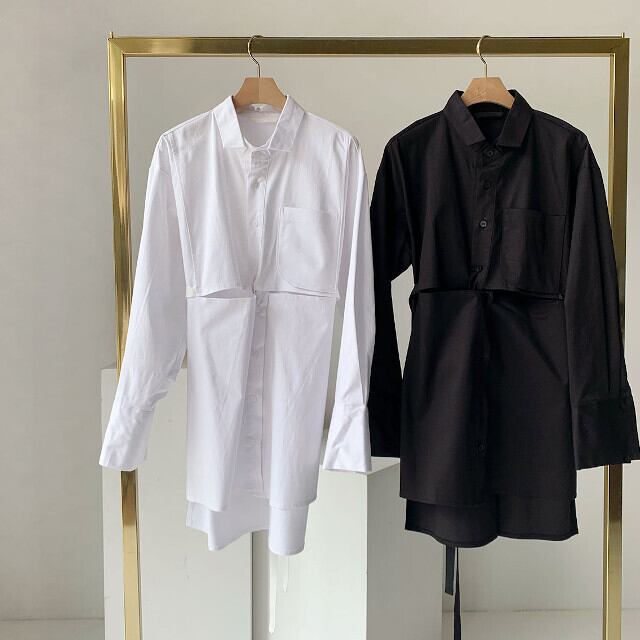 ワンピース レディース シャツワンピ 長袖 ボリューム袖 ミニ丈 ミニワンピ おしゃれ 肌見せ セクシー ホワイト/ブラック