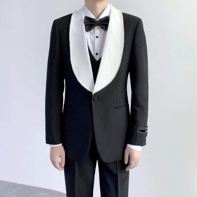 【予約販売】メンズ スーツ セットアップ 3点セット ベスト 白襟 フォーマル シンプル ブラック 黒 シングル ドレッシー ウエディング ジャケット パンツ セット クラシック レトロ パーティ 二次会 同窓会 結婚式 韓国 トレンド 大きいサイズ M/L