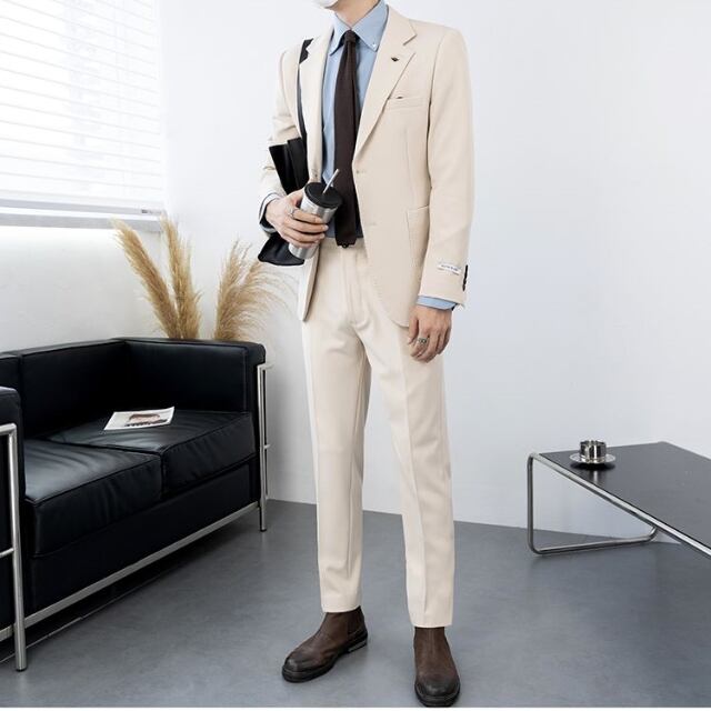 【予約販売】メンズ セットアップ スーツ シングル 無地 スリム 男前 ハンサム カジュアル 黒 ブラック/クリーム/ホワイト 婚礼 ジャケット パンツ セット セットアップ ビジネス 通勤 フォーマル パーティ 二次会 同窓会 結婚式 韓国 トレンド 春 秋 夏大きいサイズ M/L/XL/2XL/3XL/4XL
