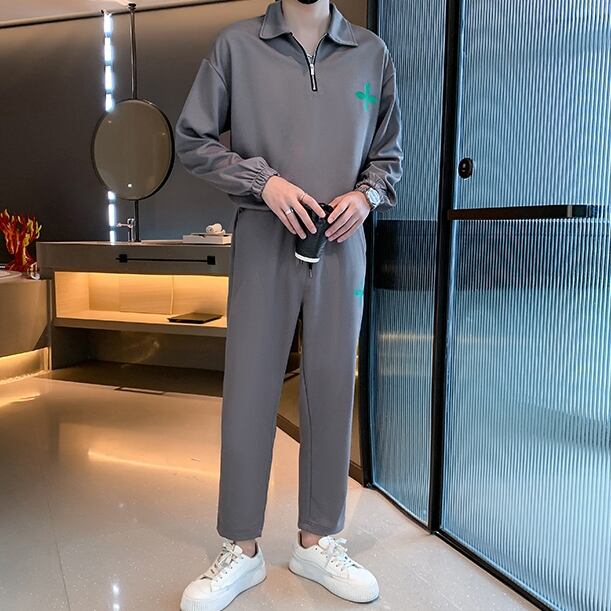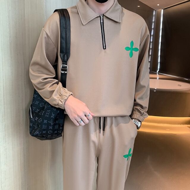 【予約販売】メンズ セットアップ 無地 ブラック/ベージュ/グレー スエット 襟 ジップアップ ワンポイント スリム カジュアル モード きれいめ 男前 パンツ セット ジャージ ジム スポーティー ダンス ジム 韓国 トレンド 大きいサイズ S/M/L/XL/2XL/3XL