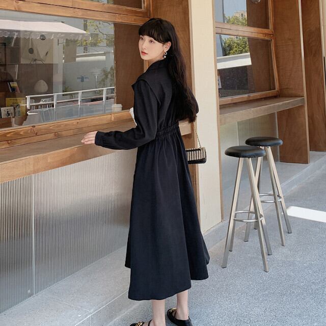 ワンピース レディース ロングワンピ ロング丈 長袖 シャツ風 ワンピースドレス オケージョン ボタン ブラック S/M/L/XL