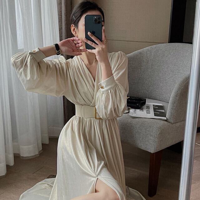 ワンピースドレス ワンピース レディース カシュクール Vネック シャーリング ベルト ウエストマーク おしゃれ スリット パーティ お呼ばれ 華やか ゴージャス シャンパン S/M/L
