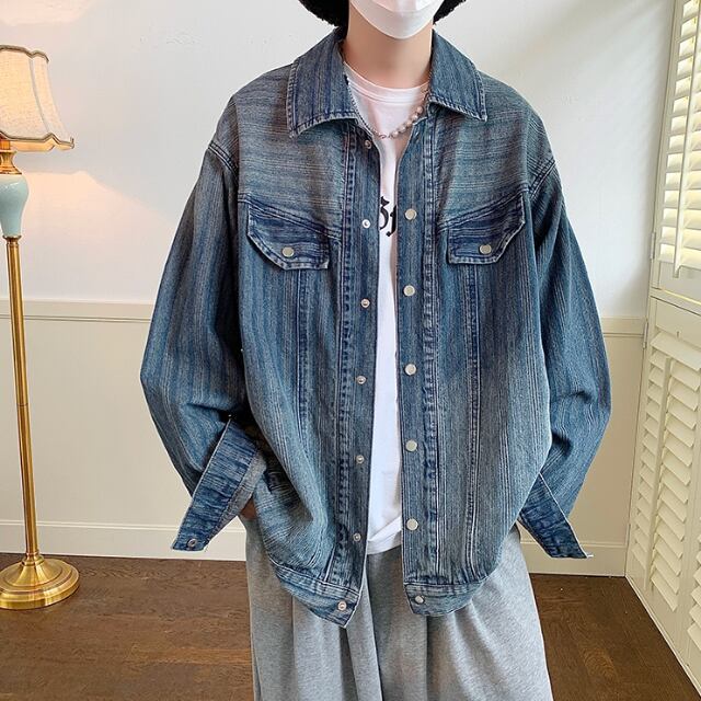 【予約販売】デニムジャケット ストライプ柄 アウター ショート丈 ジージャン メンズ ヴィンテージ ブルー お洒落 こなれ感 ベーシック 秋 冬 大きいサイズ M/L/XL/2XL