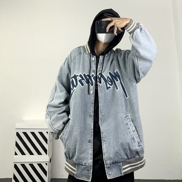 【予約販売】スタジャン ブルゾン 防寒 メンズ アウター ベイスボール デニム ライン ショート丈 オーバーサイズ こなれ感 お洒落 韓国 トレンド 秋 冬 M/L/XL