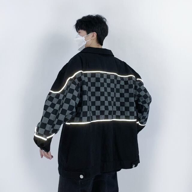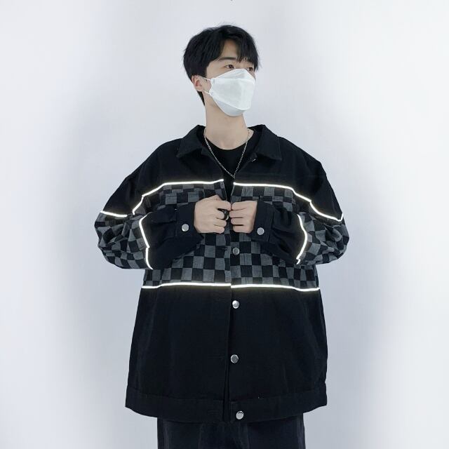 【予約販売】ジャケット 防寒 メンズ アウター チェック柄 切り替え ショート丈 オーバーサイズ ブラック こなれ感 お洒落 韓国 トレンド 秋 冬 M/L/XL