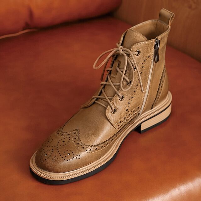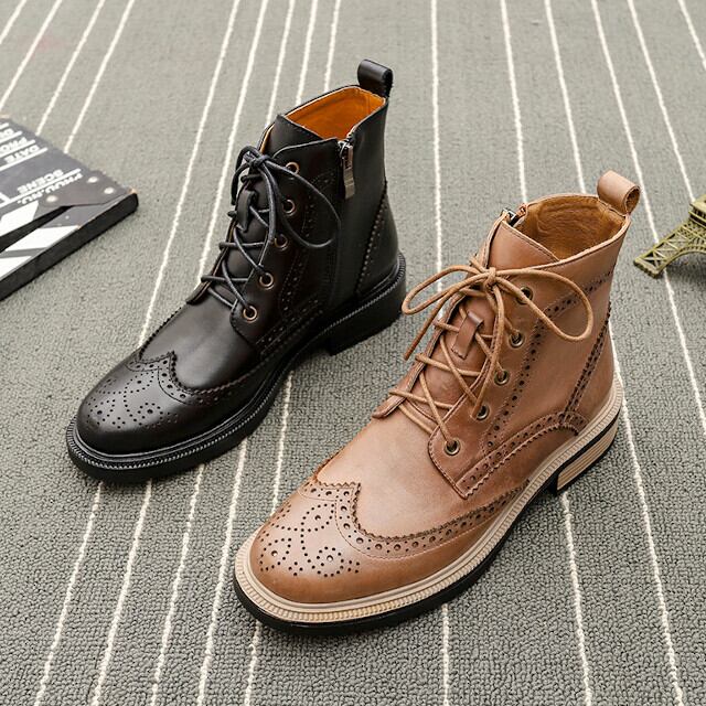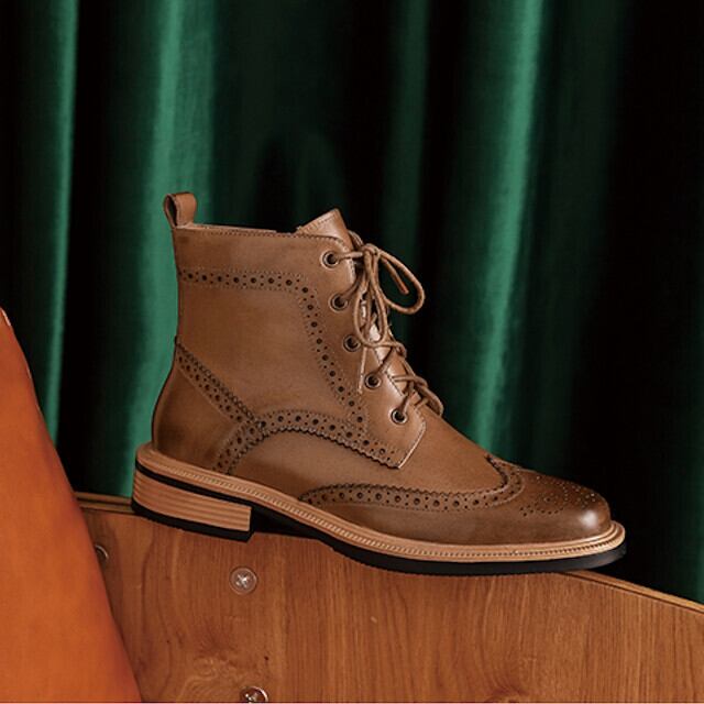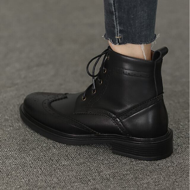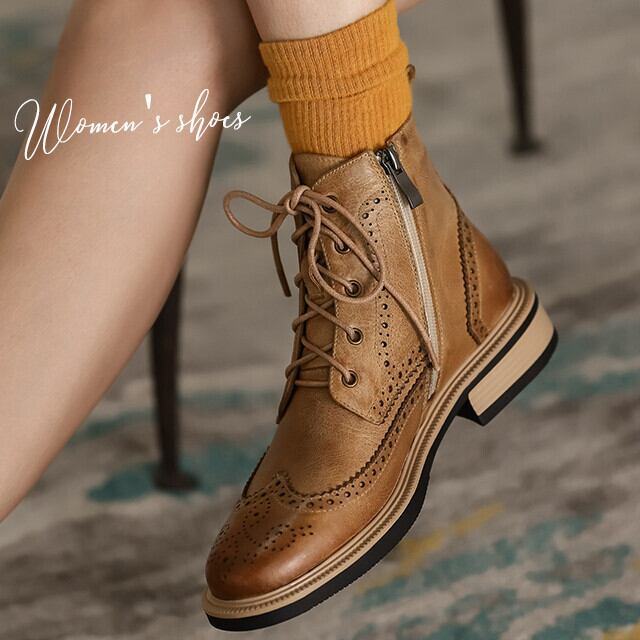 ブーツ レディース レザー ショート丈 ローヒール ブローグ レザー 靴 カジュアル 秋冬 かっこいい シンプル おしゃれ ブラック/アプリコット 35(22.5cm) 36(23cm) 37(23.5cm) 38(24cm) 39(24.5cm) 40(25cm)