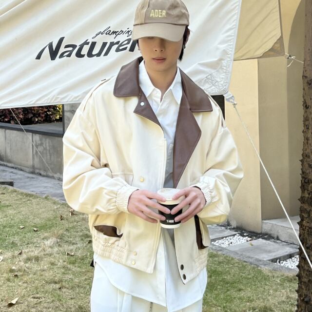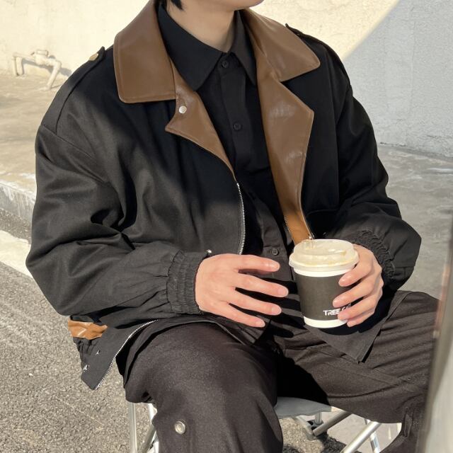 【予約販売】ブルゾン 防寒 メンズ アウター 無地 レザー 切り替え ショート丈 レトロ ブラック オフホワイト こなれ感 お洒落 韓国 トレンド 秋 冬 S/M/L/XL