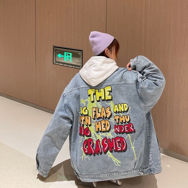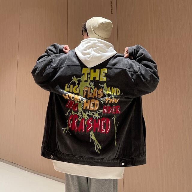【予約販売】デニムジャケット アウター 落書き バックデザイン ジージャン メンズ オーバーサイズ ジ ブラック ブルー ペア ユニセックス お揃い カップル お洒落 こなれ感 韓国 ベーシック 秋 冬 大きいサイズ M/L/XL/2XL/3XL/4XL/5XL