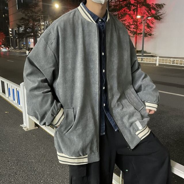 【予約販売】スタジャン ブルゾン ジャンバー 長袖 コーデュロイ アウター ショート丈 ライン メンズ グレー/ブラック 無地 お洒落 こなれ感 韓国 ベーシック 秋 冬 大きいサイズ M/L/XL/2XL/3XL/4XL/5XL