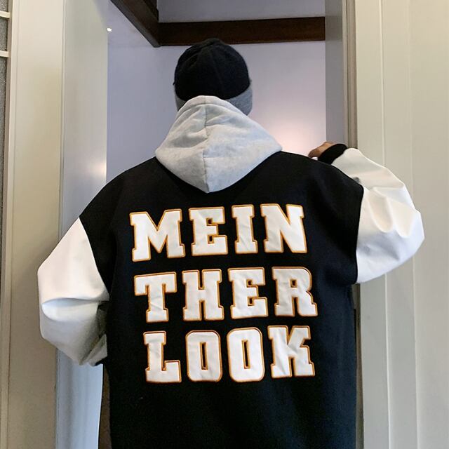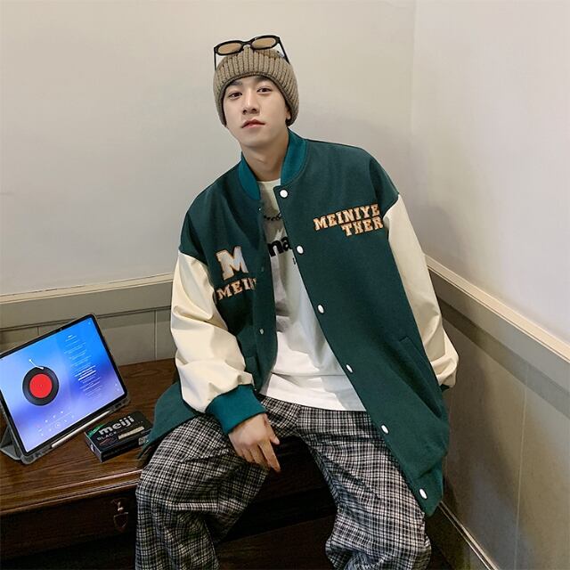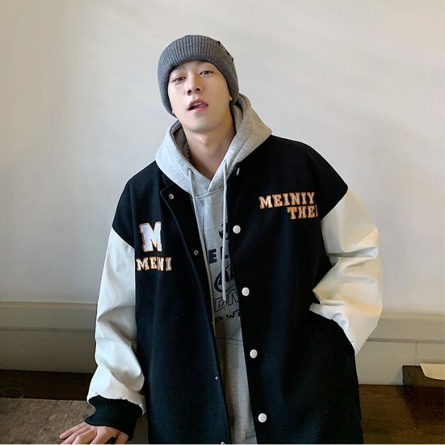 【予約販売】スタジャン ブルゾン アメリカン レザー B系 防寒 メンズ アウター カレッジ風 アメカジ ショート丈 オーバーサイズ ブラック/アイボリー/グリーン 無地 お洒落 こなれ感 韓国 ベーシック 秋 冬 大きいサイズ M/L/XL/2XL