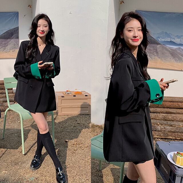 ジャケット レディース バイカラー グリーン 差し色 長袖 モード かっこいい おしゃれ 春秋 オーバーシルエット ブラック/アプリコット S/M/L