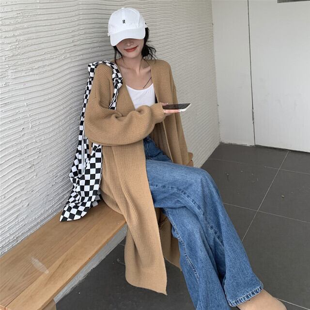 カーディガン レディース アウター 厚手 ロングカーデ ロング丈 ニット あったか おしゃれ シンプル ボリューム袖 オーバーシルエット 秋冬 カーキ/アプリコット/グレー
