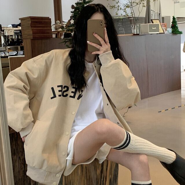 スタジャン アウター レディース ブルゾン 長袖 オーバーシルエット ロゴ シンプル かっこいい ストリート カジュアル アプリコット/グレー