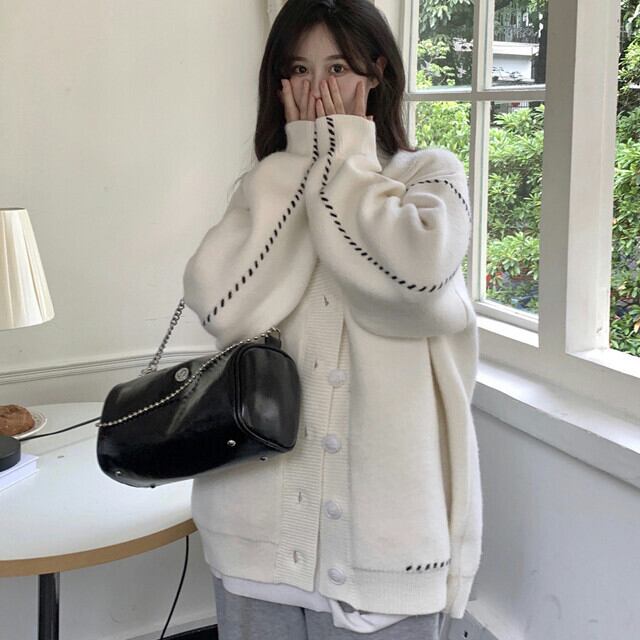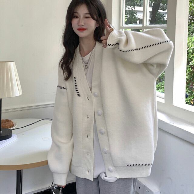 カーディガン レディース カーデ オーバーシルエット ステッチ 長袖 ゆったり おしゃれ カジュアル 秋冬春 シンプル ホワイト