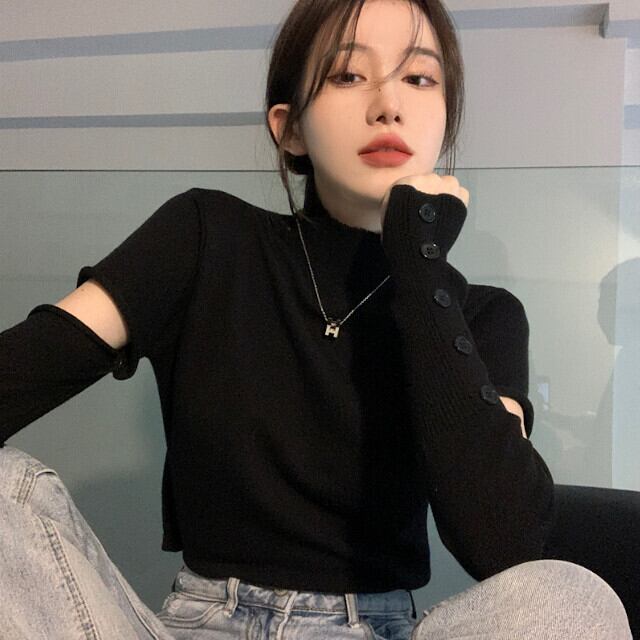 ニット セーター レディース 肌見せ おしゃれ ハイネック タートルネック アームウォーマー風 シンプル シック かわいい ブラック/ホワイト