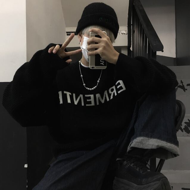【予約販売】ニット ユニセックス セーター ペア お揃い カップル 胸ロゴ ラウンドネック ブラック ブルー オーバーサイズ メンズ レディース シンプル こなれ感 ストリート お洒落 韓国 トレンド 秋冬 フリーサイズ