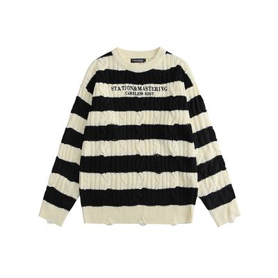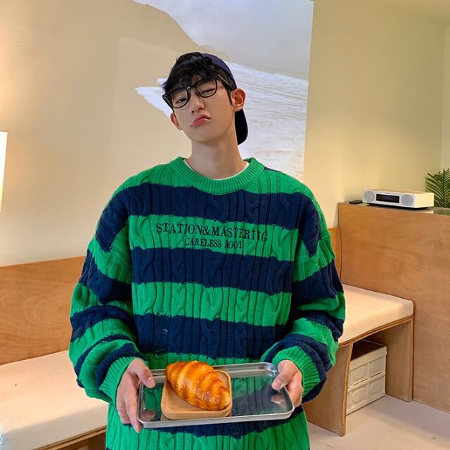 【予約販売】ニット セーター ケーブルニット ラウンドネック ボーダー柄 グリーン/ホワイト オーバーサイズ メンズ シンプル こなれ感 ストリート お洒落 韓国 トレンド 秋冬 M/L/XL