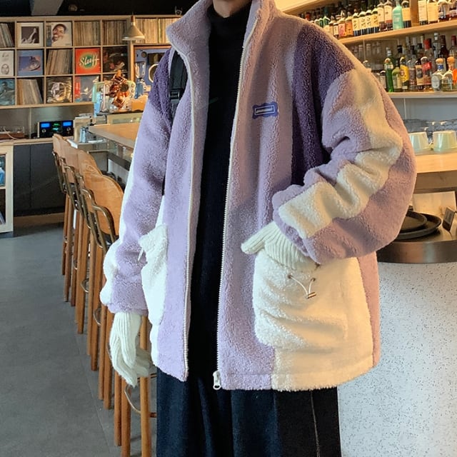 【予約販売】ボアブルゾン アウター ハイネック 総ボア もこもこ ベージュ/パープル/ブラウン 冬 防寒 ジャケット ショート丈 メンズ カジュアル 男前 こなれ感 お洒落 韓国 トレンド 秋 冬 M/L/XL/2XL