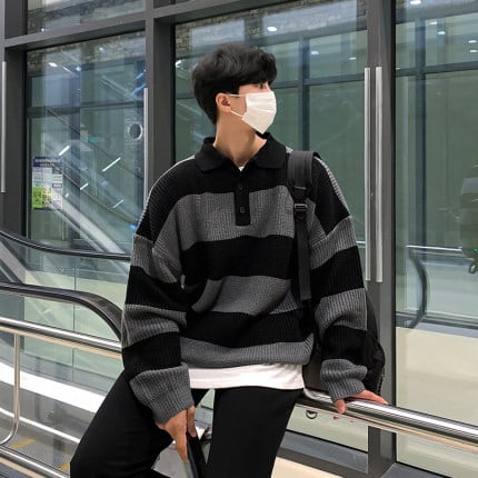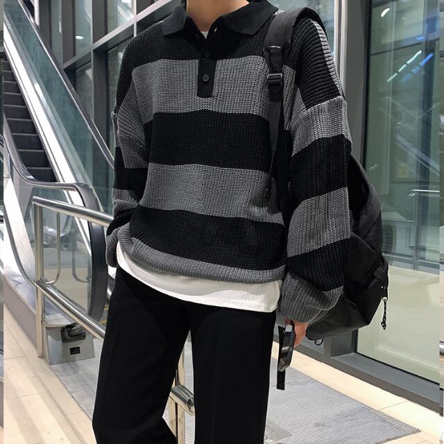 【予約販売】ニット セーター 襟付き ボーダー柄 グリーン/ブラック オーバーサイズ メンズ シンプル こなれ感 ストリート お洒落 韓国 トレンド 秋冬 M/L/XL