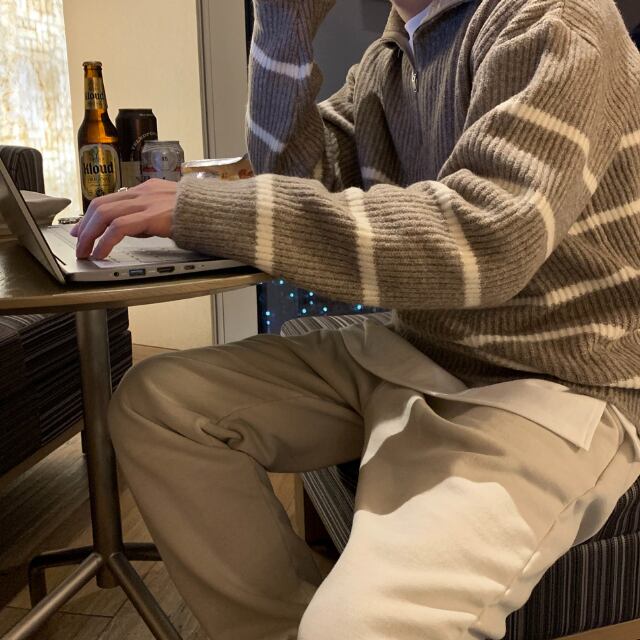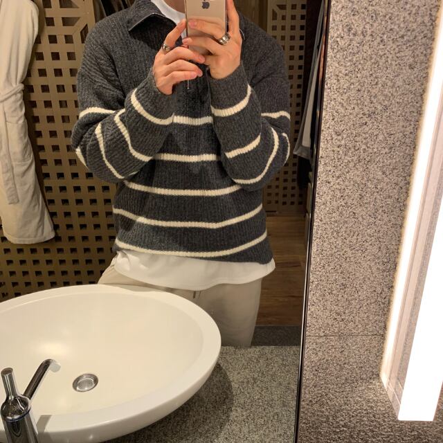 【予約販売】ニット セーター 襟付き ボーダー柄 ジップアップ ベージュ/グレー/ブラック オーバーサイズ メンズ シンプル こなれ感 ストリート お洒落 韓国 トレンド 秋冬 M/L/XL