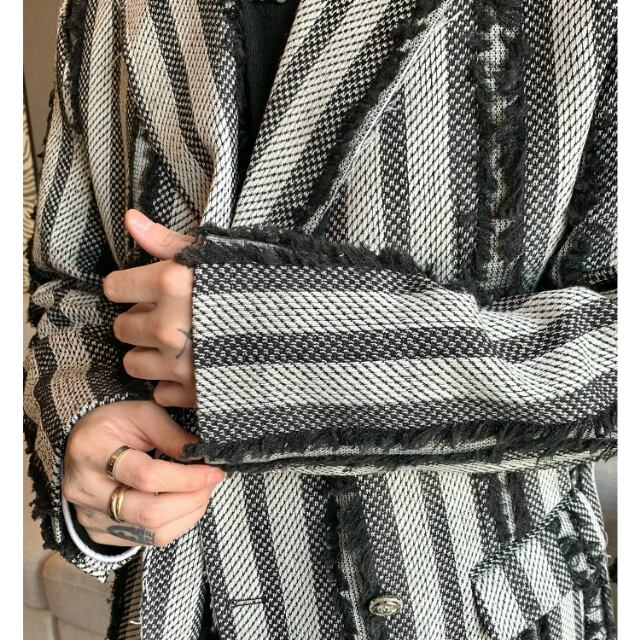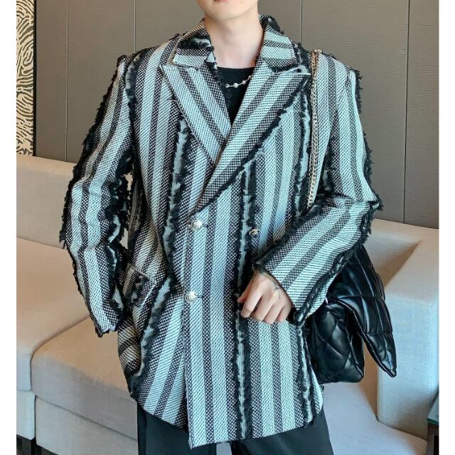 【予約販売】ジャケット 無地 個性的 フリンジ モード メンズ ストライプ柄 ブラック ホワイト ドレスアップ シック こなれ感 お洒落 韓国 トレンド 秋 冬 M/L/XL