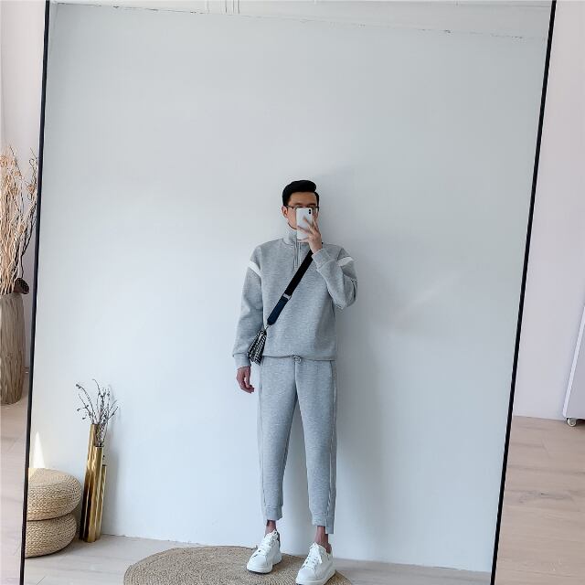 【予約販売】メンズ セットアップ 無地 シンプル ハイネック ハーフジップ ブラック/グレー/ホワイト スエット カジュアル モード きれいめ 男前 パンツ セット ジャージ ジム スポーティー ダンス ジム 韓国 トレンド 大きいサイズ M/L/XL