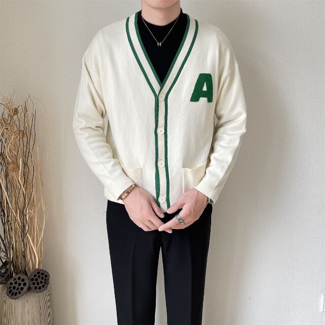 【予約販売】カーディガン ニット メンズ アウター 無地 カレッジ風 ブラック ホワイト ライン カジュアル シック 総柄 男前 こなれ感 お洒落 韓国 トレンド 秋 冬 M/L/XL/2XL/3XL