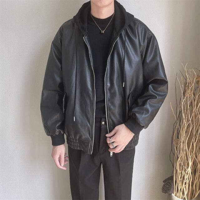 【予約販売】ブルゾン アウター ジップアップ レザー 革ジャン フード付 ドッキング ブラック ジャケット ショート丈 メンズ カジュアル 男前 こなれ感 お洒落 韓国 トレンド 秋 冬 M/L/XL/2XL