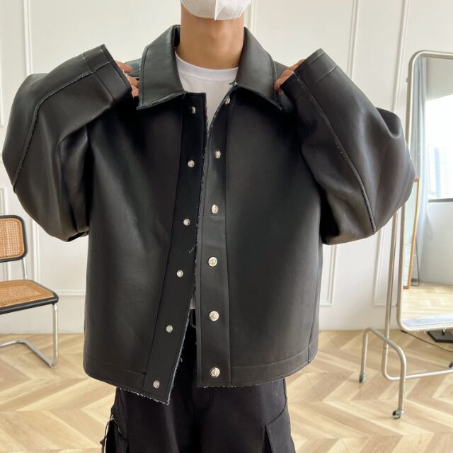 【予約販売】ブルゾン アウター レザー デニム リバーシブル 革ジャン ジージャン 無地 ブラック ジャケット ショート丈 メンズ カジュアル 男前 こなれ感 お洒落 韓国 トレンド 秋 冬 M/L/XL