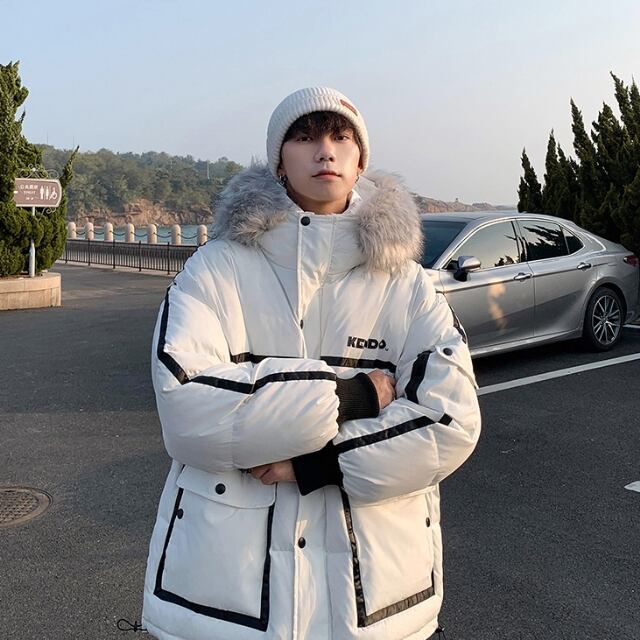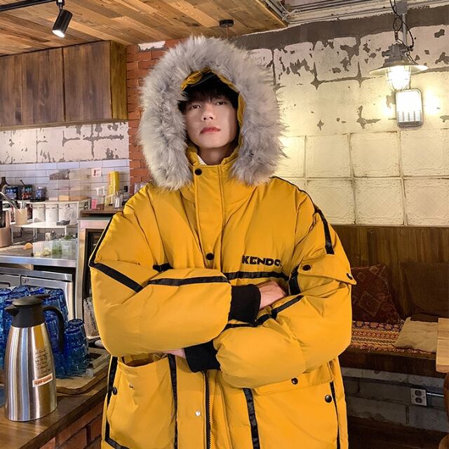 【予約販売】ダウンジャケット アウター ショート丈 シンプル フード付 ファー 防寒 メンズ ブラック イエロー ホワイト 防寒 お洒落 こなれ感 ベーシック 秋冬 大きいサイズ M/L/XL/2XL