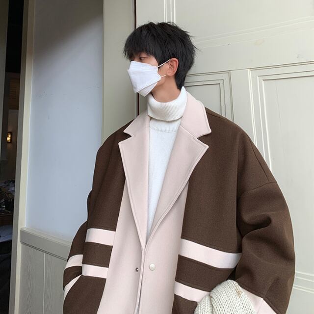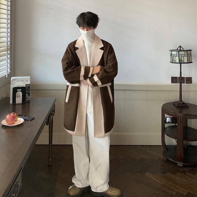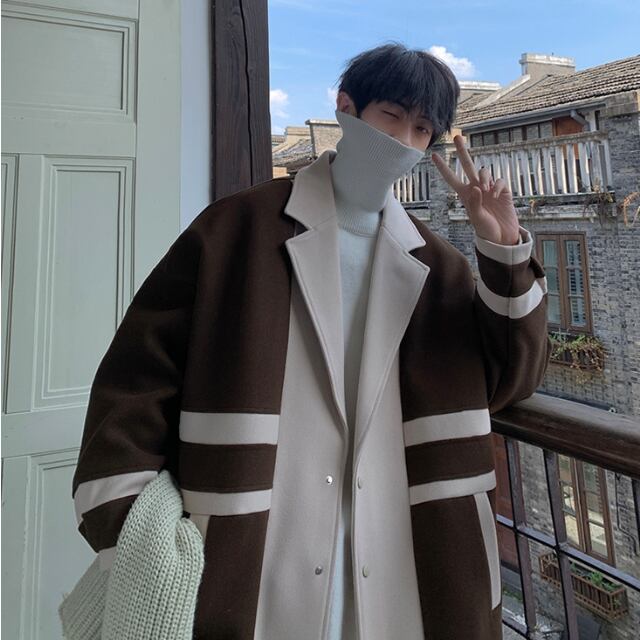 【予約販売】チェスターコート アウター ミドル丈 シンプル バイカラー ライン 通学 ビジネス 防寒 メンズ ブラウン/カーキ/ブラック シック 防寒 お洒落 こなれ感 ベーシック 秋冬 大きいサイズ M/L/XL/2XL