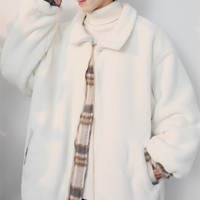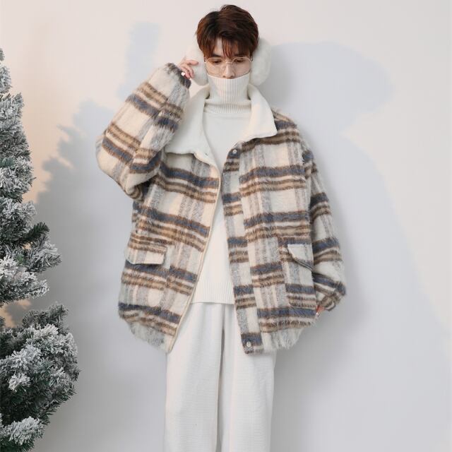 【予約販売】ボアブルゾン アウター リバーシブル ブラウン ブルー チェック柄 冬 ジャケット ショート丈 メンズ カジュアル 男前 こなれ感 お洒落 韓国 トレンド 秋 冬 M/L/XL/2XL