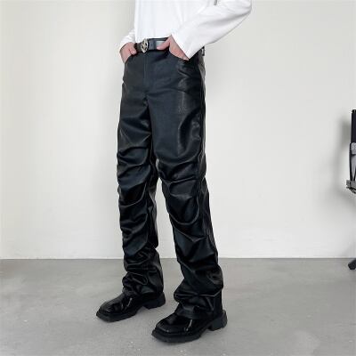 【予約販売】レザーパンツ ボトムス メンズ シワ加工 シンプル スリム ブラック カジュアル こなれ感 お洒落 韓国 トレンド 秋 冬 M/L/XL