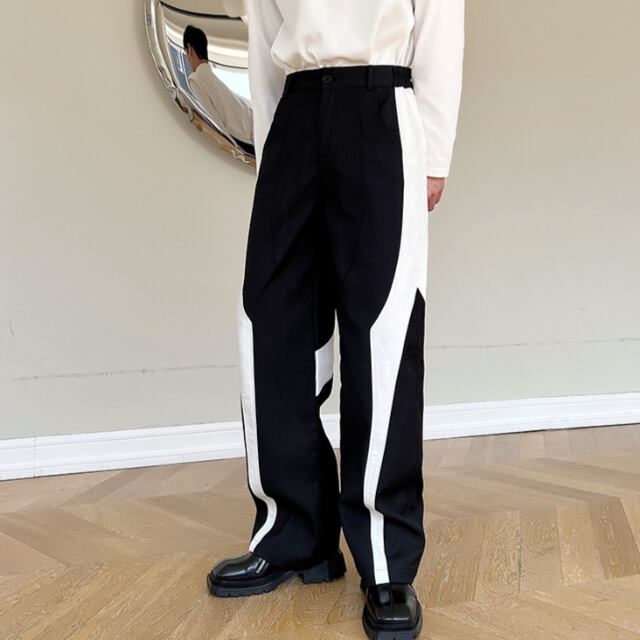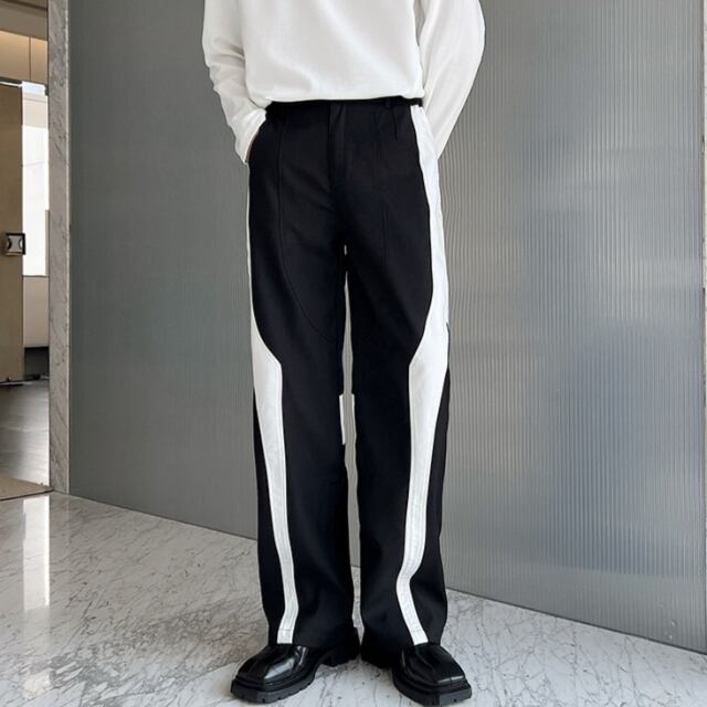 【予約販売】パンツ ボトムス メンズ ストレートルーズ シンプル バイカラー ライン ブラック カジュアル こなれ感 お洒落 韓国 トレンド 秋 冬 M/L/XL