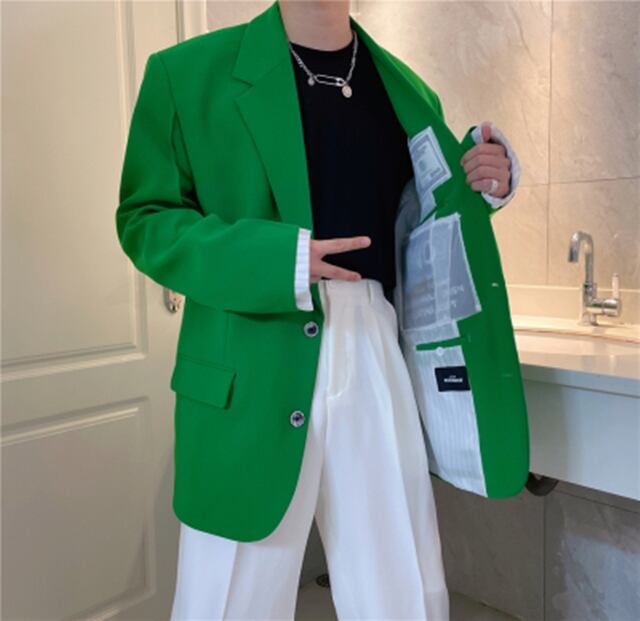 【予約販売】ジャケット 無地 個性的 差し色 メンズ 袖 グリーン ブラック 裏地 ドレスアップ シック こなれ感 お洒落 韓国 トレンド 秋 冬 S/M/L/XL