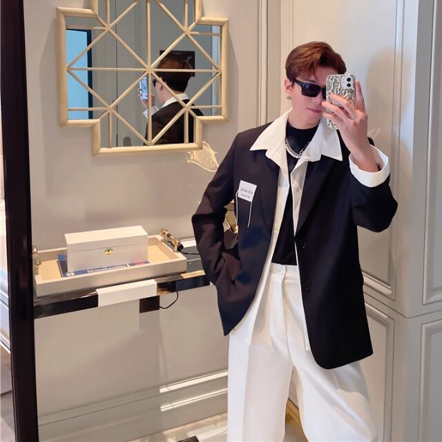 【予約販売】ジャケット 無地 個性的 フェイクツーピース 重ね着風 メンズ 袖 ブラウン ブラック ドレスアップ シック こなれ感 お洒落 韓国 トレンド 秋 冬 S/M/L/XL