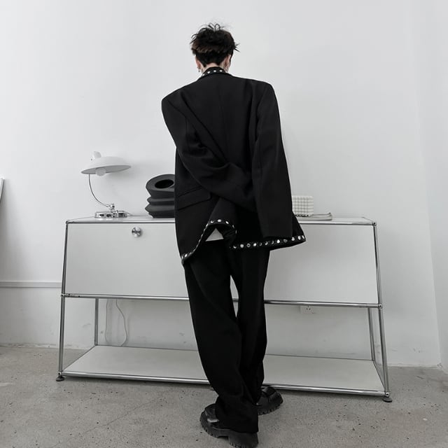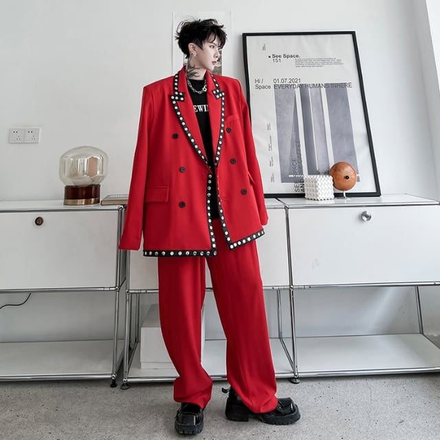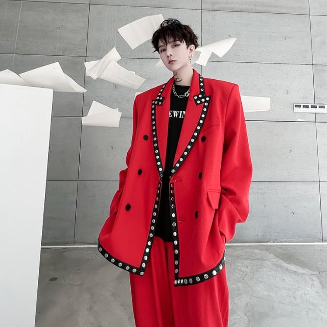 【予約販売】メンズ スーツ レッド ブラック パイピング バイカラー 派手 個性的 男前 ジャケット パンツ セット セットアップ パーティ パーティー 二次会 同窓会 結婚式 韓国 トレンド M/L/XL