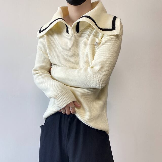 【予約販売】ニット セーター 無地 襟 ビッグカラー ライン セーラー ブラック ホワイト モード オーバーサイズ メンズ シンプル こなれ感 ストリート お洒落 韓国 トレンド 秋冬 フリー Free