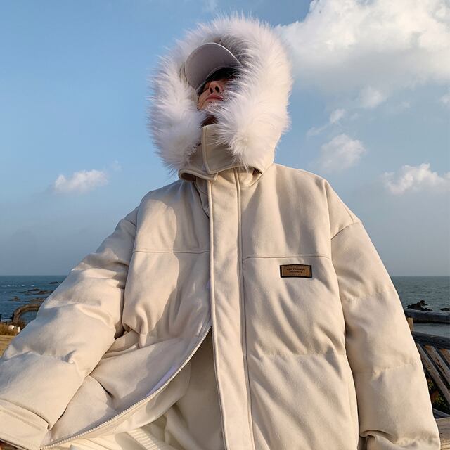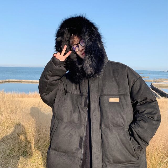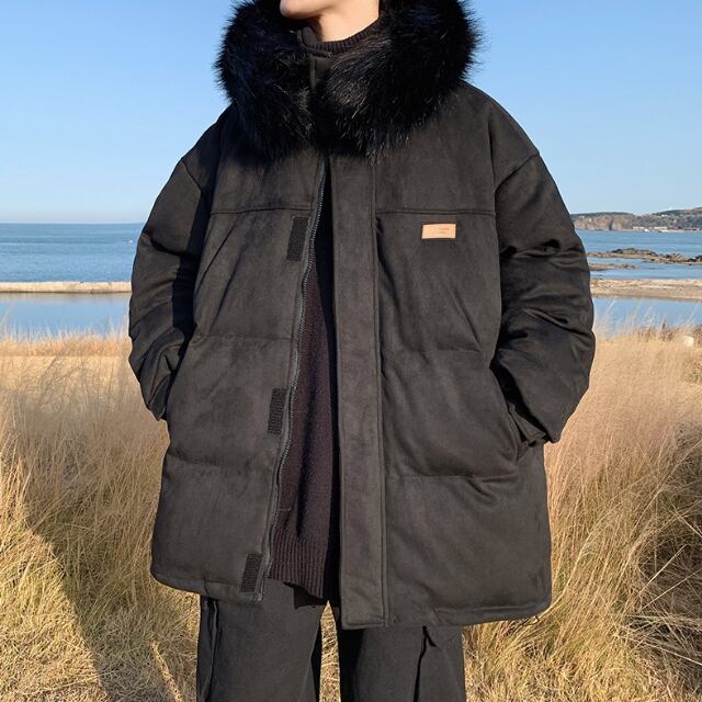 【予約販売】ダウンコート メンズ 無地 フード付き スエード アウターファーフード ブラック ホワイト ショート丈 防寒 お洒落 こなれ感 ベーシック 秋冬 大きいサイズ M/L/XL/2XL