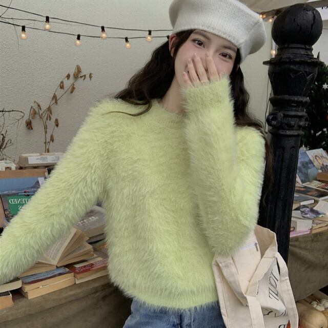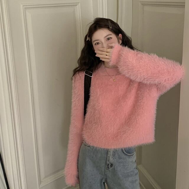 セーター レディース トップス ニット シンプル かっこいい ラウンドネック オーバーシルエット 一枚映え おしゃれ ハイセンス ファー モヘア ふわふわ ピンク/ミルクティー/ホワイト/グリーン