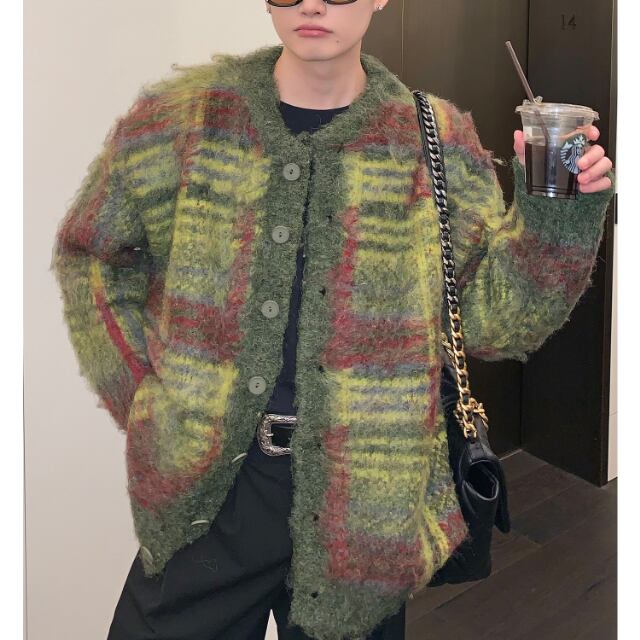 【予約販売】カーディガン ニット チェック柄 ゆったり セーター グリーン ブルー オーバーサイズ メンズ シンプル こなれ感 ストリート お洒落 韓国 トレンド 秋冬 M/L/XL