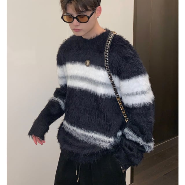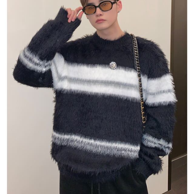 【予約販売】ニット セーター グレー/ブラック ボーダー柄 ラウンドネック モヘア シック メンズ シンプル こなれ感 ベーシック お洒落 韓国 トレンド 秋冬 M/L/XL
