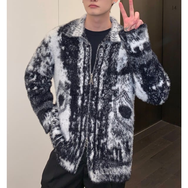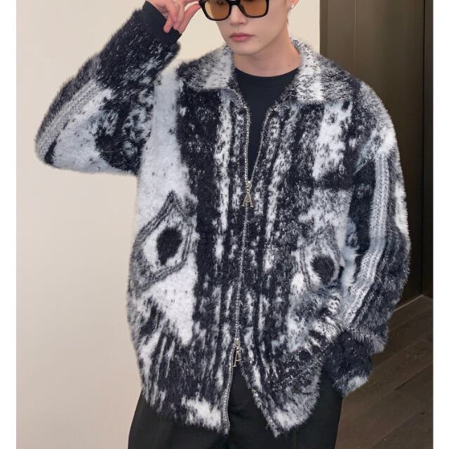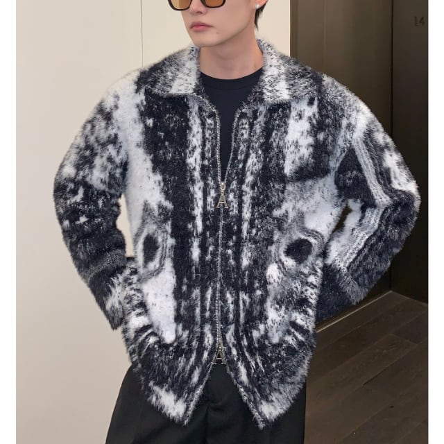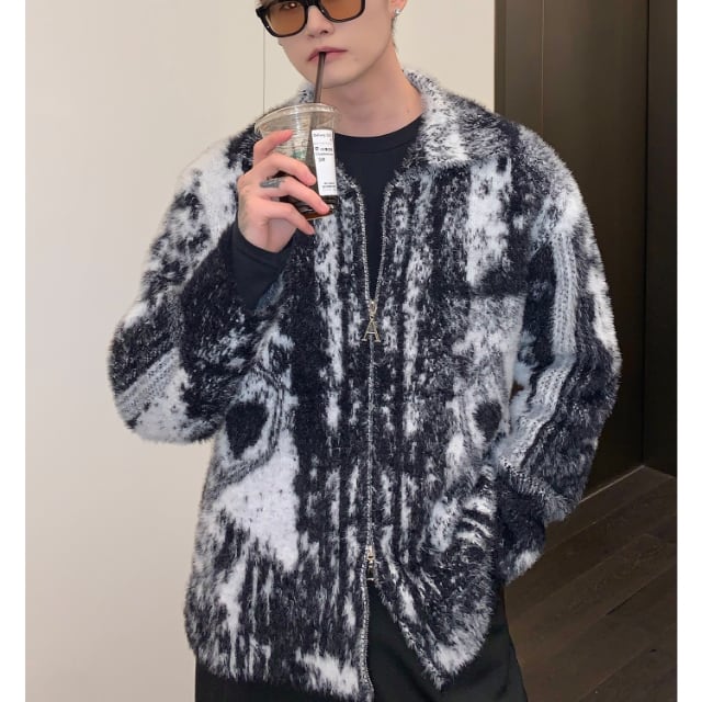 【予約販売】カーディガン ニット ジップアップ ゆったり 総柄 セーター タイダイ ブラウン ブラック オーバーサイズ メンズ シンプル こなれ感 ストリート お洒落 韓国 トレンド 秋冬 M/L/XL