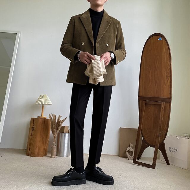 【予約販売】テーラードジャケット 無地 メンズ コーデュロイ ブラック カーキ ダブル ドレスアップ シック パーティー 結婚式 こなれ感 お洒落 韓国 トレンド 秋 冬 M/L/XL/2XL