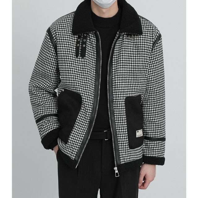 【予約販売】フライトジャケット ブルゾン アウター ジップアップ 千鳥格子柄 襟ボア ブラウン ブラック ジャケット ショート丈 メンズ カジュアル 男前 こなれ感 お洒落 韓国 トレンド 秋 冬 M/L/XL
