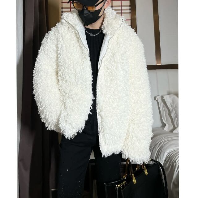 【予約販売】ボアブルゾン アウター ジップアップ 総ボア 無地 ホワイト ブラック ジャケット ショート丈 メンズ カジュアル 男前 こなれ感 お洒落 韓国 トレンド 秋 冬 M/L/XL